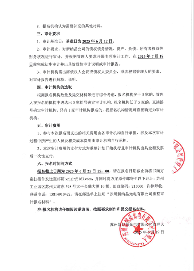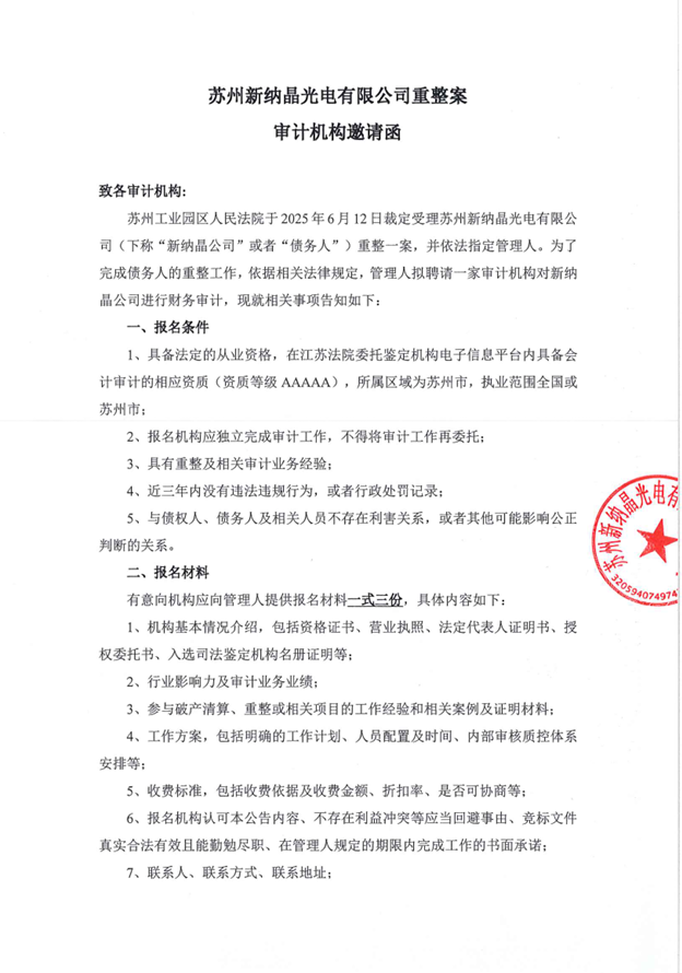 蘇州新納晶光電有限公司關于公開招募審計機構的公告