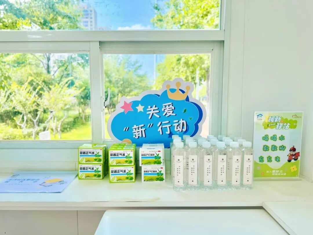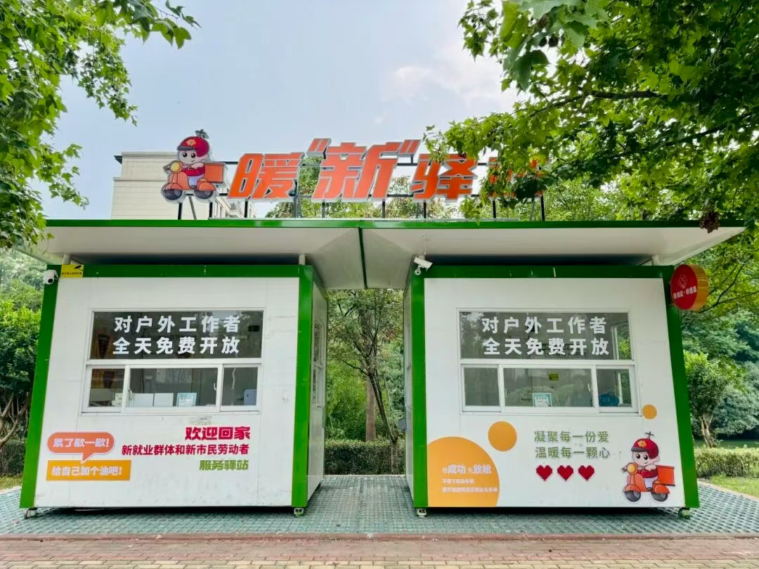 這個不大的空間,由兩座閑置亭子改造而成:空調送出徐徐涼風,充電插座的指示燈靜靜閃爍,墻上掛著共享雨傘,角落的便民箱里備有礦泉水、創可貼等物資。最讓騎手們滿意的是,驛站24小時開放,即便深夜下班,也能進來喝上一口熱水。