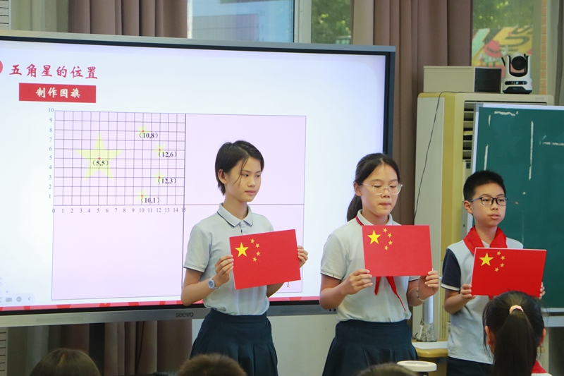 揚州市文峰小學(xué)陳姝君老師執(zhí)教《數(shù)說“中國紅”》,將數(shù)學(xué)與美術(shù)學(xué)科相融合,以國旗設(shè)計為主任務(wù),引導(dǎo)學(xué)生在“認識國旗-設(shè)計國旗-制作國旗”的實踐活動過程中,逐步培養(yǎng)學(xué)生的空間觀念、學(xué)科情感和家國情懷。